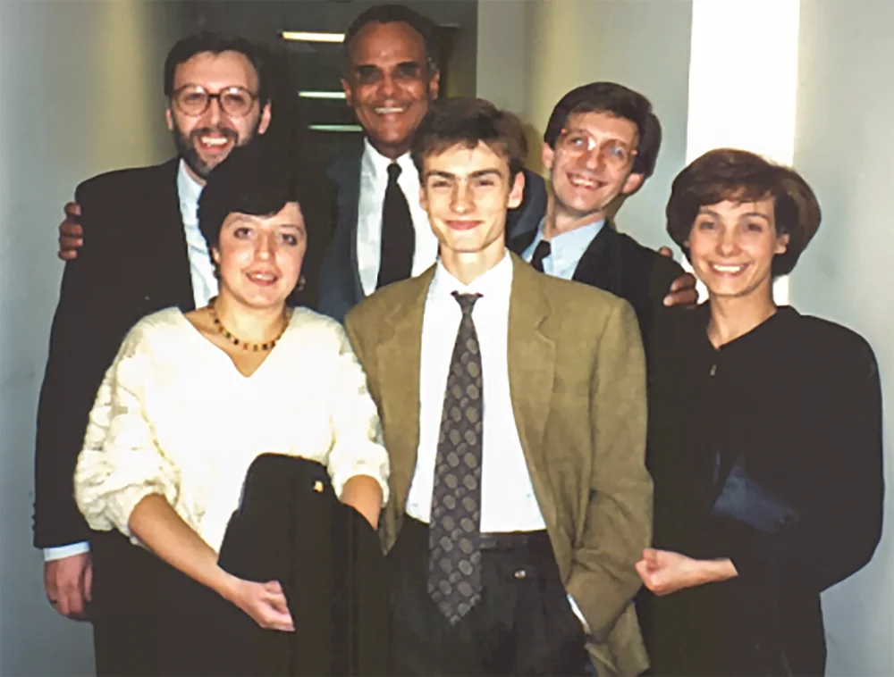 Harry was leaning against a wall-mounted radiator and when we reached him, he looked at us exclaiming “You are the three from the first row!” … “Yes, we are” we replied, and a 15-minute conversation started. Nuccio and I we weren’t fluent in English yet, though we could understand him, so most of that conversation was with Carlo. Harry made us feel so comfortable that it was as if we were longtime friends. An amazing human being. Anyhow I do remember that at a certain moment I told him: “Harry, you know that we are almost relatives?”. He looked at me with a questioning expression, so I said, “Your name is Belafonte; mine is Bellagamba; do you know what it means?” … He replied he knew what “Bella” means (beautiful), but not the rest of the name, so I explained that Bellagamba means “beautiful leg”. He had a clear laugh at my words, giving me a hug.